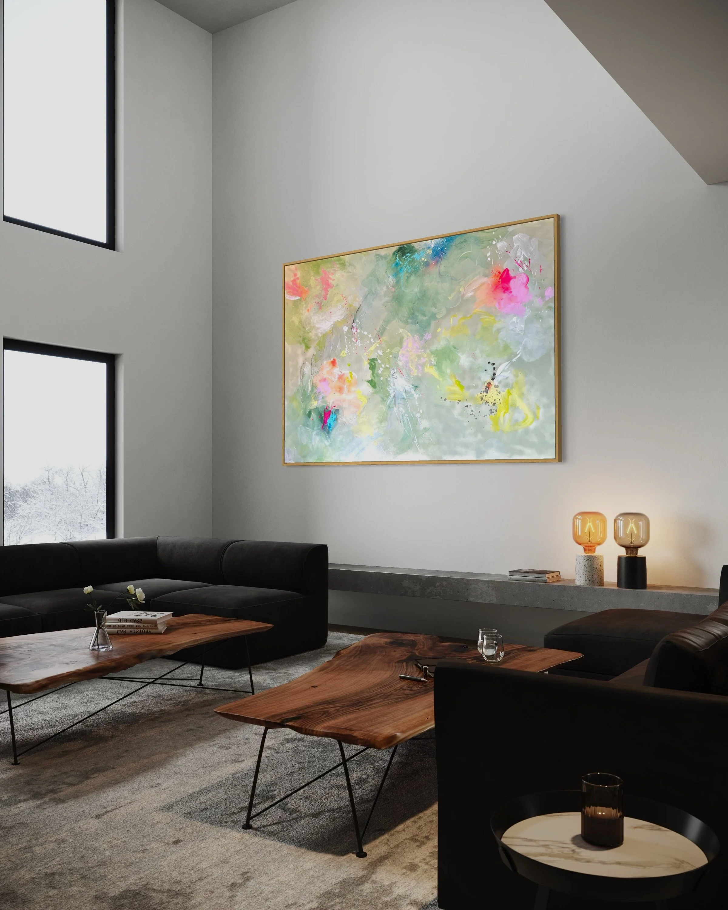 Wat dit schilderij bijzonder maakt, is hoe het verandert met het licht. Afhankelijk van het moment van de dag verschuiven de groene tinten van diep smaragd naar lichter aqua - soms richting het grijs. Die diepte wordt versterkt door het gelaagde proces: texture paste als basis, acrylverf voor de kleur, en waterige acryl drops die lagen toevoegen.